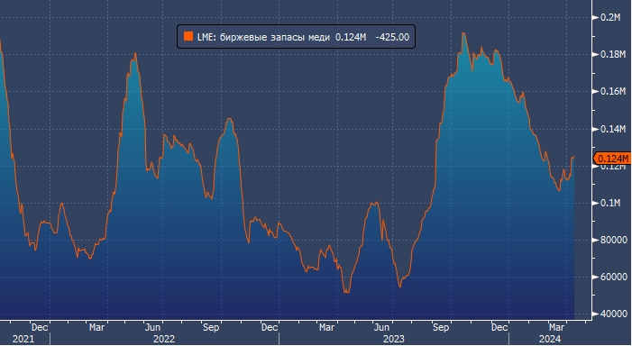Биржевые запасы меди в Лондоне.