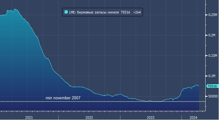 Биржевые запасы никеля в Лондоне.