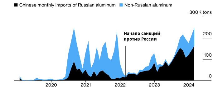 Даже без официальных санкций объем импорта российского алюминия в Китай достиг рекордных уровней. В прошлом году российский алюминиевый гигант «Русал» получил 23% выручки в Китае по сравнению всего с 8% в 2022 году. Компания также приобрела 30% акций китайского глиноземного завода, чтобы восполнить дефицит в поставках ключевого ингредиента на фоне перебоев, спровоцированных военным конфликтом.