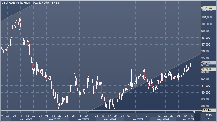 В итоге доллар впервые с октября 2023 стал стоить дороже 94 рублей на фоне того, как индекс доллара против 6 основных валют поднялся до 5-месячного максимума на уровне 106,5 пункта.