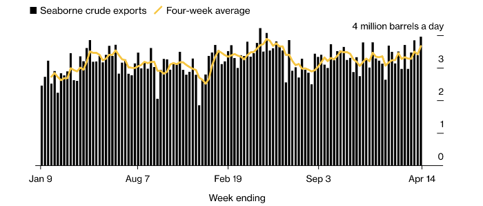 Потоки российской нефти по морю за неделю до 14 апреля выросли на 560 000 баррелей в день до 3.95 млн. Это максимум с мая 2023 года. Менее волатильный четырехнедельный средний показатель также вырос — примерно на 250 000 баррелей в день до 3.66 миллиона, достигнув максимума с июня.