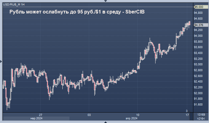 Рубль может ослабнуть до уровня 95 руб./$1 на торгах в среду, полагают аналитики SberCIB Investment Research.