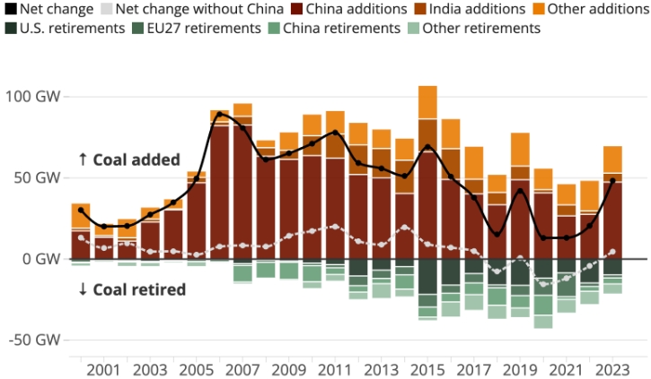 По данным исследования, в стадии реализуемого строительства находится чуть менее 200 ГВт, в том числе 140 ГВт в Китае. Уровень выбытия угольных электростанций в Китае на фоне опасений по поводу энергетической безопасности в прошлом году также был самым низким за десятилетие.
