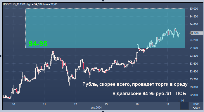 Валютная пара доллар/рубль, скорее всего, будет торговаться в диапазоне 94-95 руб./$1 в среду, прогнозирует начальник отдела экономического и отраслевого анализа Промсвязьбанка (ПСБ) Евгений Локтюхов.