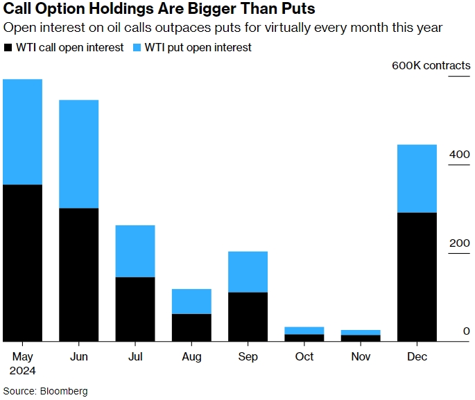 Объемы "бычьих" опционов на нефть выросли до рекордного уровня, в результате чего премия по опционам колл по сравнению с опционами пут подскочила на этой неделе до максимума с октября, поскольку Израиль поклялся принять ответные меры после ракетных атак Ирана и атак беспилотников в выходные.