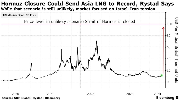 Закрытие Ормузского пролива может привести к рекордной цене сжиженного природного газа в Азии, говорит Rystad Energy. Хотя этот сценарий все еще маловероятен, рынок сосредоточен на напряженности между Израилем и Ираном. Спотовая цена на СПГ в Северной Азии. Цена указана в долларах США за миллион британских тепловых единиц. Источник: S&P Global; Rystad Energy; Блумберг