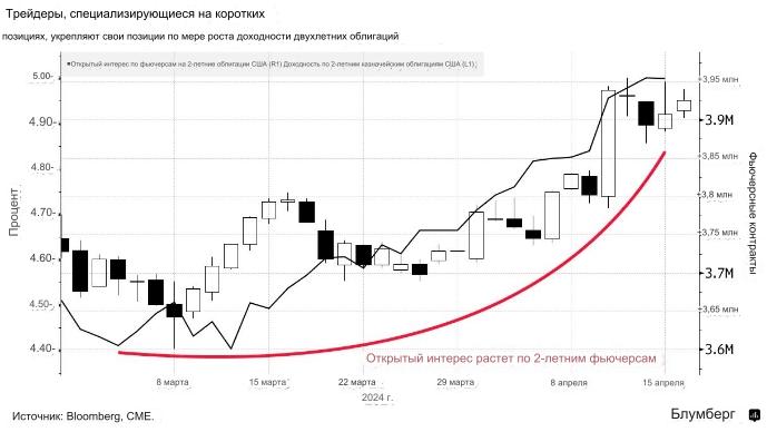 Устойчивый негативный тон на рынке можно увидеть по масштабам наращивания медвежьих позиций в структуре открытого интереса по двухлетним казначейским фьючерсам, где новые позиции, а не ликвидация, были очевидны в 13 из последних 14 торговых сессий по мере роста доходности.