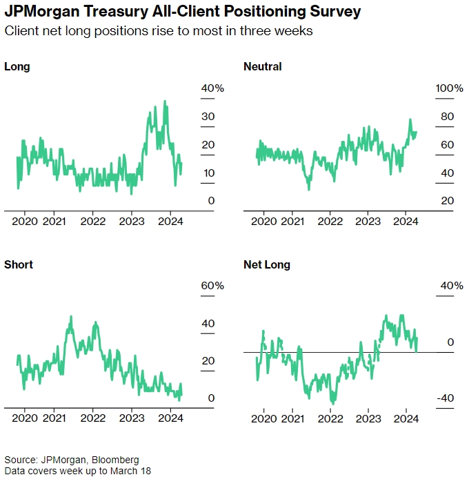 JPMorgan Treasury All-Client Positioning Survey. Чистые длинные позиции клиентов выросли до максимума за три недели. Источник: JPMorgan, Bloomberg. Данные охватывают неделю до 18 марта