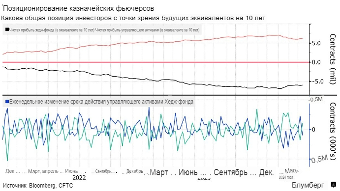 Данные CFTC за 9 апреля, за день до выхода последнего отчета по инфляции в США, показали, что хедж-фонды закрывали короткие позиции, продолжая тенденцию с начала января. Последний раунд покрытия шортов был эквивалентен примерно 112 000 фьючерсов на 10-летние облигации, что является самым большим показателем с 27 февраля. С начала года короткие позиции хедж-фондов по дюрации ликвидировались в течение 11 из 15 недель. С другой стороны, управляющие активами умеренно сокращали чистые длинные позиции за тот же период времени. По последним данным, счета с "реальными деньгами" освободили почти 100 000 эквивалентов 10-летних фьючерсов от своих чистых длинных позиций по дюрации, как показывают данные.