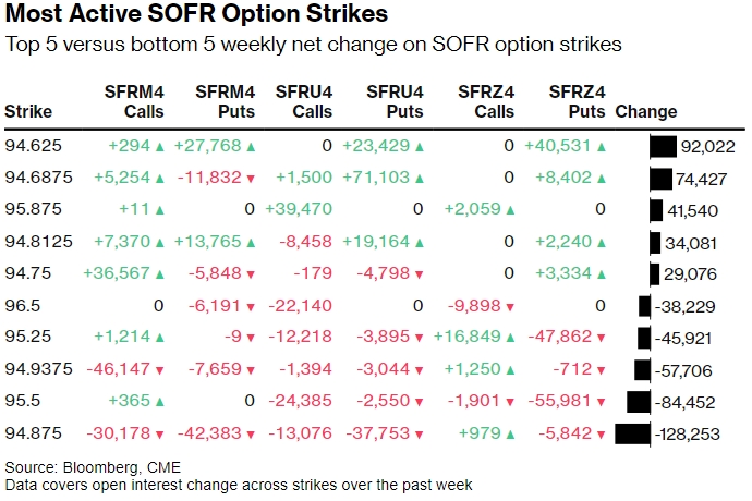 На прошедшей неделе наблюдалась повышенная активность в страйке 94,625: спрос на путы на 24 декабря последовал за потоками, включая крупного покупателя путов SFRZ4 95,00/94,625/94,25. Потоки также были активны в страйке 94,6875 после таких действий, как покупки в SFRZ4 9