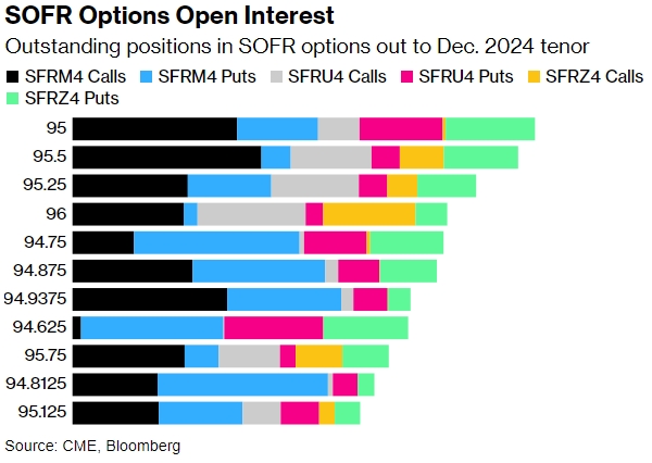 Наиболее распространенными опционами SOFR со сроком погашения 24 декабря является уровень 95,00, что эквивалентно ставке 5%, где в коллах 24 июня можно увидеть большие объемы открытого интереса. Большой объем открытого интереса также был замечен в колах 25 июня по страйку 95,50, который является вторым по открытому интересу. Среди других опционов остается приличное количество открытого интереса к опционам 24 июня со страйками 94,75, 94,875 и 94,9375.