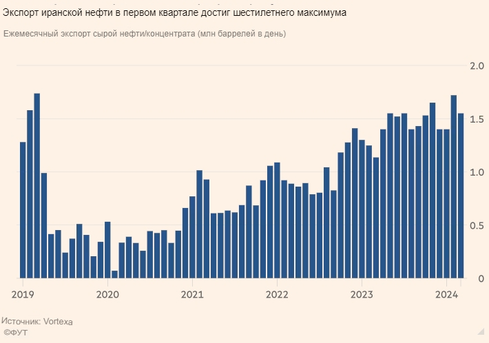 Успех Ирана в экспорте нефти подчеркивает трудности, с которыми сталкиваются США и ЕС, пытающиеся усилить давление на Тегеран после его ракетной атаки и атаки беспилотников на Израиль.