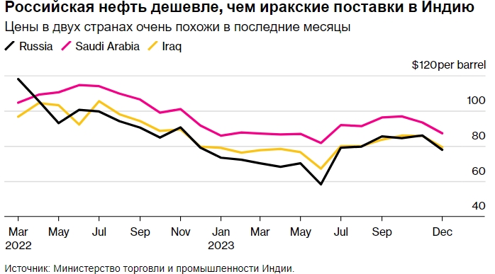 Российская нефть дешевле иракской в Индии. Цены на нефть из двух стран в последние месяцы очень похожи. Источник: Министерство торговли и промышленности Индии