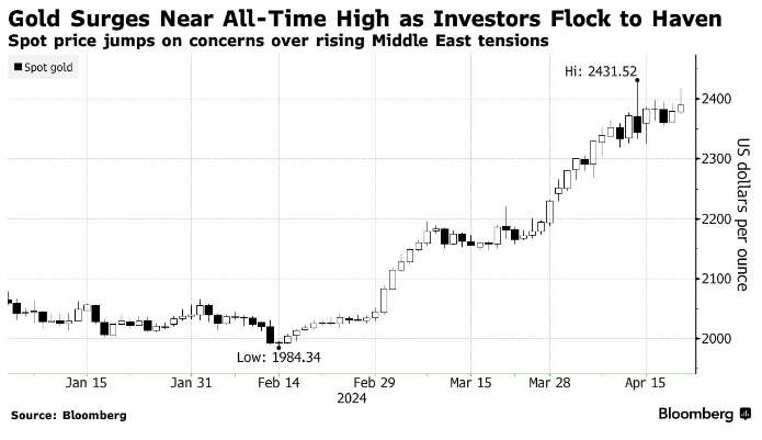 С середины февраля цены на металлы бьют рекорды в ходе мощного ралли, вызванного перспективой снижения процентных ставок в США, продолжающимися закупками со стороны центральных банков и высоким потребительским спросом, особенно в Китае. Возросшая международная напряженность также способствовала росту цен на драгоценный металл, который ранее в течение дня преодолел отметку в 2400 долларов за тонну.