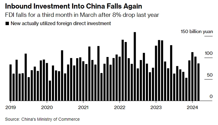 Объем входящих инвестиций за первые три месяца этого года составил 301 млрд юаней, что на 26 % меньше, чем за тот же период прошлого года, сообщила заместитель министра торговли Го Тинтин. Она объяснила резкое падение высокой базой для сравнения с январем-мартом 2023 года, в котором наблюдался рекордный приток инвестиций.