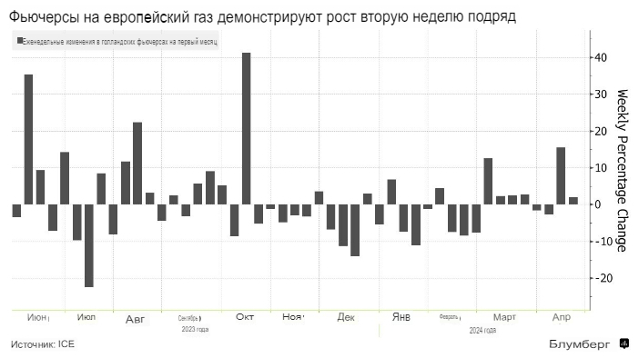 Голландские фьючерсы, являющиеся эталоном европейского газа, упали на 2,7% до 31,45 евро за мегаватт-час по состоянию на 12:02 в Амстердаме. Таким образом, рост на этой неделе составил около 2%.