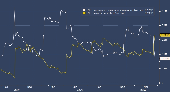 Ликвидные запасы алюминия на LME сократились на 20% до 171,2 тыс. тонн по состоянию на 19 апреля, что было вызвано увеличением количества заявок на изъятие металла со складов в Порт-Кланге, Малайзия. За неделю ликвидные запасы (on Warrant) сократились почти вдвое из-за заказов на металл в Азии. При этом запасы Cancelled Warrant (отмененные), соответственно, выросли на сопоставимую величину до 333 тыс. т. По состоянию на конец марта более 90% металла на складах LME было российского происхождения.