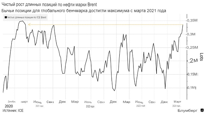Тем не менее, управляющие деньгами настроены наиболее оптимистично по отношению к Brent с марта 2021 года, поскольку они скупают контракты, чтобы получить прибыль от любого скачка вверх на фоне усиления напряженности. Другие рынки также сигнализируют о бычьем настрое: опционы колл на нефть, которые приносят прибыль при росте цен, торгуются с премией по сравнению с противоположными опционами пут.