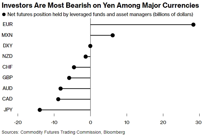 Среди основных валют инвесторы наиболее негативно относятся к иене. Источники: Комиссия по торговле товарными фьючерсами, Bloomberg