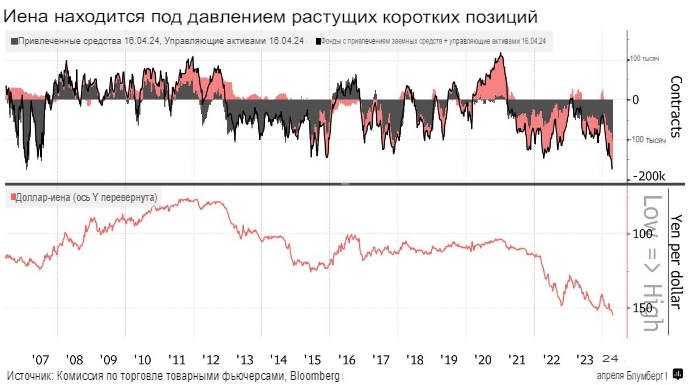 Ставки фондов с кредитным плечом и управляющих активами на ослабление иены выросли до более чем 173 000 контрактов по состоянию на 16 апреля, что является рекордным показателем по данным Комиссии по торговле товарными фьючерсами, начиная с 2006 года. Согласно расчетам Bloomberg, это самая крупная короткая позиция среди девяти основных валют, что делает иену особенно уязвимой для болезненного отскока вверх.