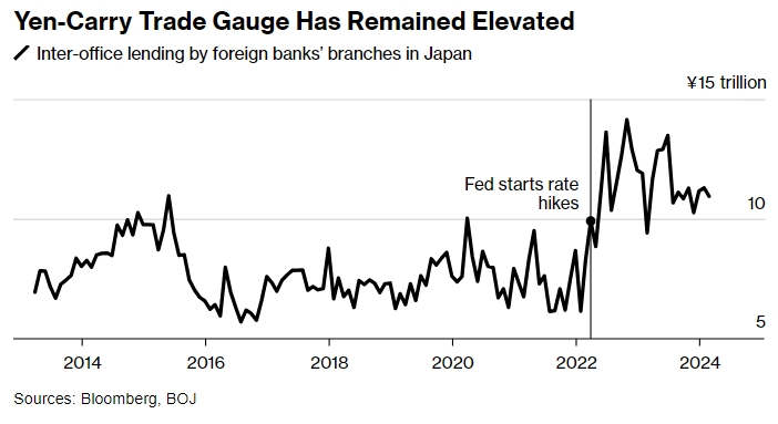 Объем кредитования иностранными банками своих основных офисов в Японии - ключевой показатель спроса на операции carry trade, финансируемые иеной, - остается повышенным с начала агрессивного повышения ставок ФРС в марте 2022 года, что усилило расхождения в политике азиатской страны и США.