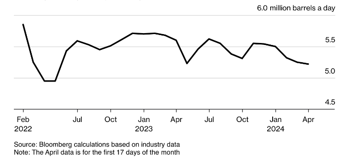 В целом за апрель объем переработки нефти в России в среднем составлял около 5,23 млн баррелей в сутки, что близко к самому низкому уровню с мая прошлого года.