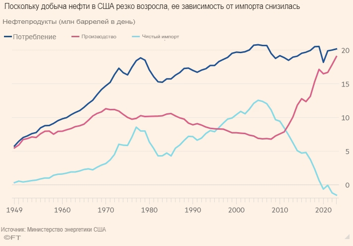 Сейчас США производят почти 20 млн баррелей нефти в день, что примерно соответствует уровню потребления. Импорт из Персидского залива резко сократился, и в 2019 году США впервые стали нетто-экспортером нефти. Плодородные сланцевые месторождения Пермского бассейна в Техасе и Нью-Мексико доставляют больше нефти, чем Кувейт, Ирак или ОАЭ, три мощных центра ОПЕК.