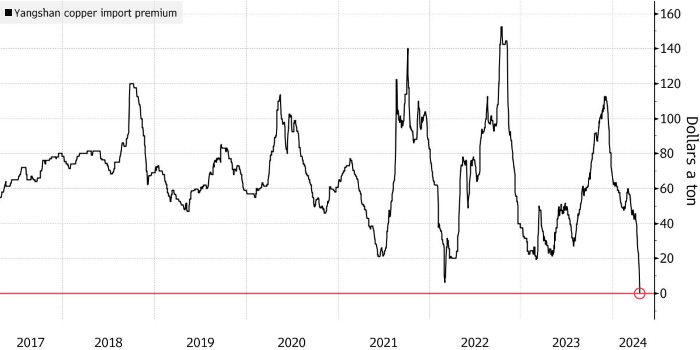 Показатель, который только что упал до нуля, называется «премией Яншань». Он назван по имени прибрежного района Шанхая, где расположены склады с импортной медью. Региональные премии выплачиваются поверх цен на мировых биржах, поэтому дают представление о покупательском спросе. На пике они поднимались выше $150 за тонну.