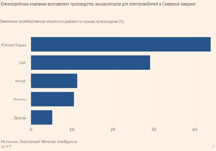 По прогнозам южнокорейских производителей аккумуляторов LG Energy Solution, SK On и Samsung SDI, получивших миллиарды долларов по программе IRA, к 2030 году на их долю будет приходиться 44 процента от общего объема аккумуляторов в Северной Америке, согласно данным Benchmark.