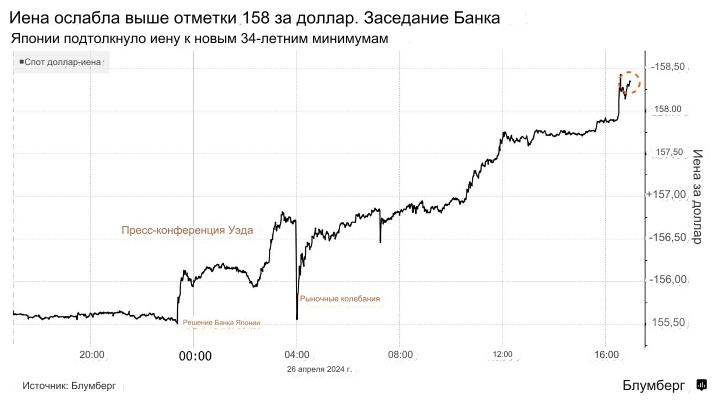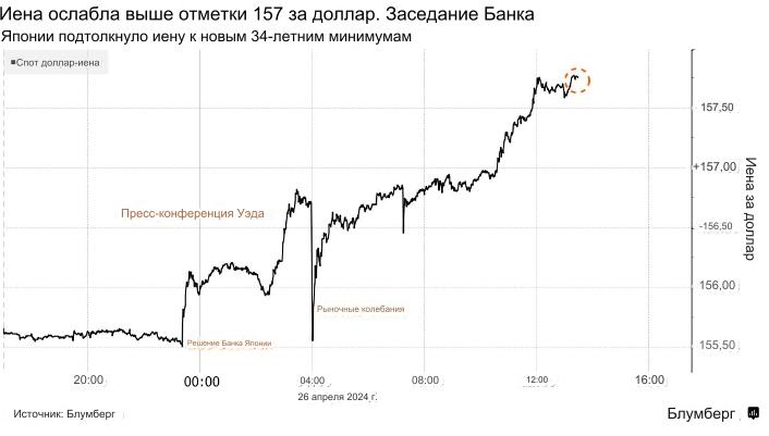 За день японская валюта подешевела на 1,8 % и достигла сессионного минимума 158,33 за доллар, причем потери ускорились на поздних торгах в Нью-Йорке. Падение началось ранее днем, после заседания Банка Японии, на котором центральный банк оставил ключевую процентную ставку без изменений, а управляющий Кадзуо Уэда не сказал ничего, что могло бы поддержать иену во время пресс-конференции.