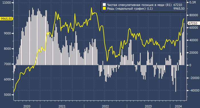 На этой неделе цена меди на LME превышала $10 000 за тонну, что является самым высоким уровнем с апреля 2022 года. С начала года металл подорожал на 16,5%, и спекулянты ждут «продолжения банкета».