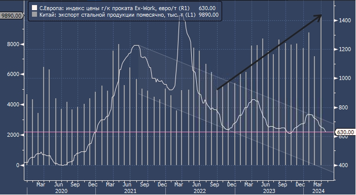 Поскольку внутренний спрос не восстанавливается так сильно, как ожидалось, экспорт стальной продукции из Китая вырос на 25% в марте в годовом исчислении до 9,89 млн тонн, что является самым высоким показателем с июля 2016 года.