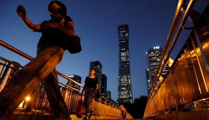 Пешеходы идут по эстакаде возле небоскребов в центральном деловом районе Пекина, 21 августа 2023 года. REUTERS/Флоренс Ло.