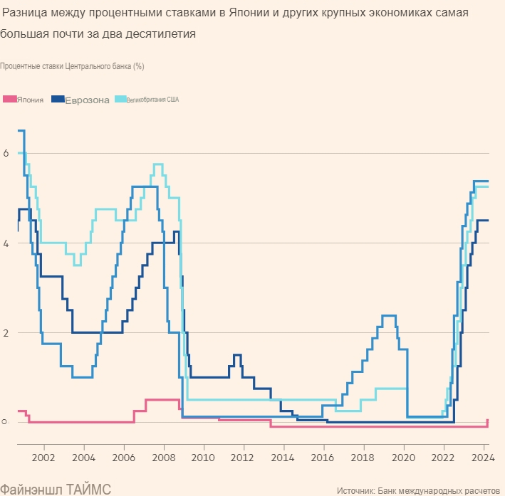 Аналитики заявили, что ослабление иены является симптомом огромной разницы между процентными ставками в Японии, где Банк Японии будет с трудом обосновывать любое повышение ставок, пока внутреннее потребление остается вялым, и в США, где Федеральная резервная система, скорее всего, будет удерживать ставки на более высоком уровне еще долгое время.