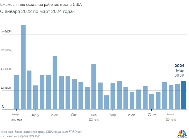 Действительно, рынок труда был полон сюрпризов в этом году, превзойдя оценки Уолл-стрит в то время, когда многие экономисты ожидали замедления темпов роста занятости. Мартовский прирост в 303 000 человек побил прогнозы и стал частью большого количества данных, свидетельствующих о том, что экономика труда остается сильной, зарплаты продолжают расти, а инфляция не сильно изменилась после резкого снижения в 2023 году.