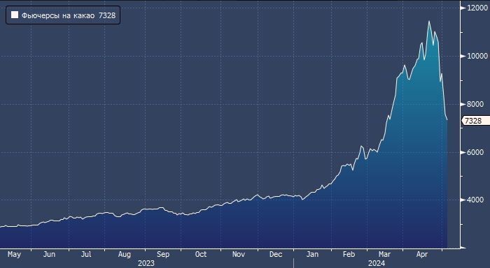 Цена снизилась почти на треть за неделю, хотя с начала года она растет на 74%, что отражает опасения по поводу нехватки предложения из-за плохих урожаев в ведущих производителях Кот-д'Ивуара и Ганы. По словам людей, знакомых с ситуацией, трейдеры откладывают покупку какао-бобов, поскольку покупка форвардных контрактов, необходимых для хеджирования, стала слишком дорогой, что приводит к дефициту ликвидности, говорят аналитики Commerzbank со ссылкой на Bloomberg.