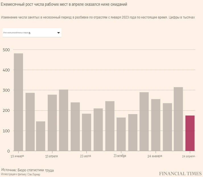 В апреле в США было создано 175 000 рабочих мест, что оказалось значительно ниже ожиданий, и стало признаком того, что рынок труда в крупнейшей экономике мира охлаждается.
