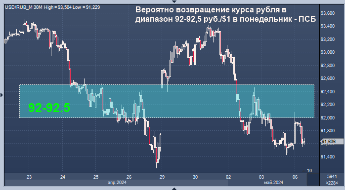Вероятно возвращение курса рубля в диапазон 92-92,5 руб./$1 в понедельник, считает начальник отдела экономического и отраслевого анализа Промсвязьбанка (ПСБ) Евгений Локтюхов.