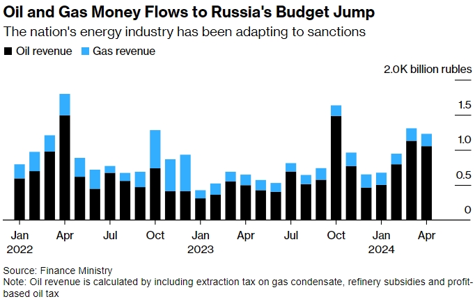 Согласно расчетам Bloomberg Economics, в 2024 году Россия получит около 126 миллиардов долларов в виде налоговых поступлений от нефти и газа. Эти цифры «лишь немного выше прогнозов нынешнего правительства», - говорит Алекс Исаков, экономист Bloomberg Economics по России.