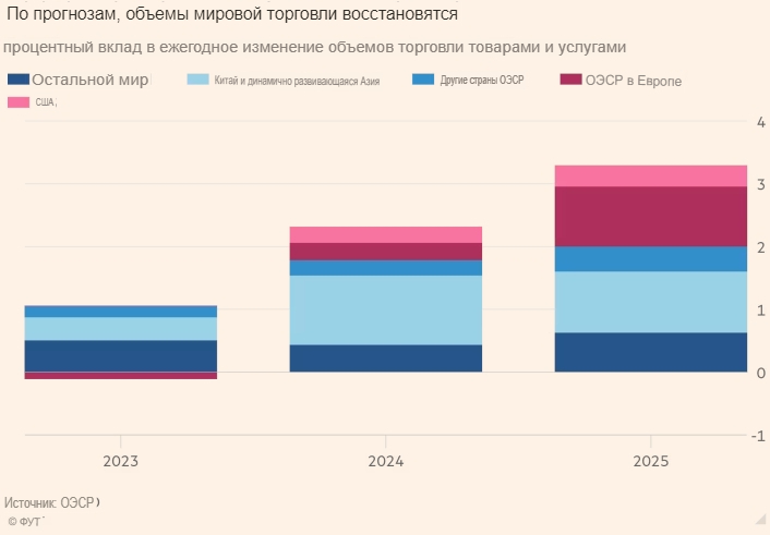 По данным ОЭСР, ожидается, что мировая торговля товарами и услугами вырастет на 2,3 процента в этом году и на 3,3 процента в 2025 году. Для сравнения, в прошлом году рост составил всего 1 процент.