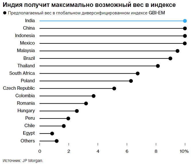 Индия получит максимально возможный вес в индексе. Источник: JP Morgan