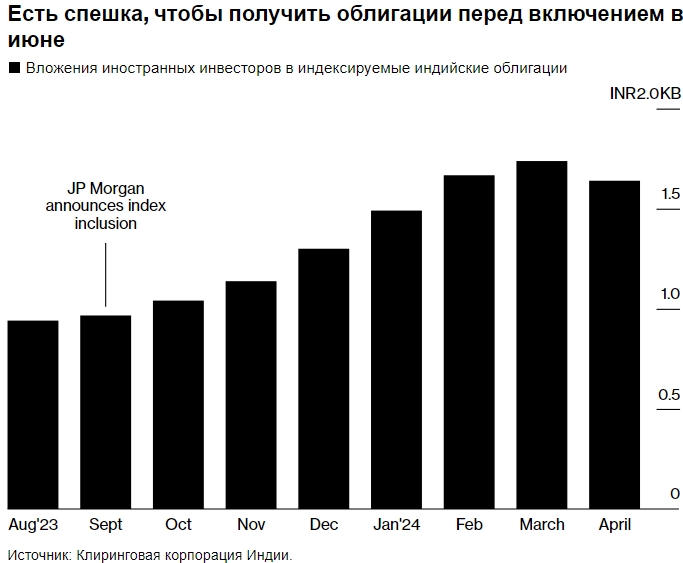 Спешка в приобретении облигаций перед включением в июне. Источник: Клиринговая корпорация Индии