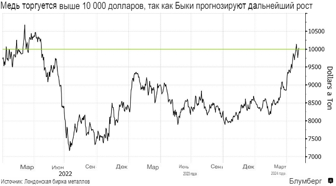 Медь преодолела отметку в 10 000 долларов за тонну, поскольку окрепли ожидания инвесторов в отношении предстоящего снижения ставки Федеральной резервной системы, а Goldman Sachs Groups Inc. предупредила об усилении дефицита предложения.