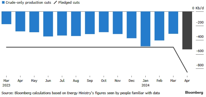 В апреле Россия обязалась добывать на 350 000 баррелей в день меньше, чем в предыдущем месяце, что превысило объявленные в феврале 2023 года ограничения добычи на 500 000 баррелей в день. Целевой уровень суточной добычи в стране на апрель составил 9,099 млн баррелей.