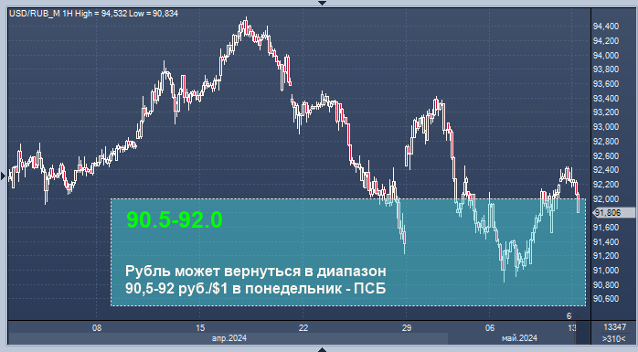 Курс валютной пары доллар/рубль может вернуться в диапазон 90,5-92 руб./$1 на торгах в понедельник, говорится в комментарии начальника отдела экономического и отраслевого анализа Промсвязьбанка (ПСБ) Евгения Локтюхова.