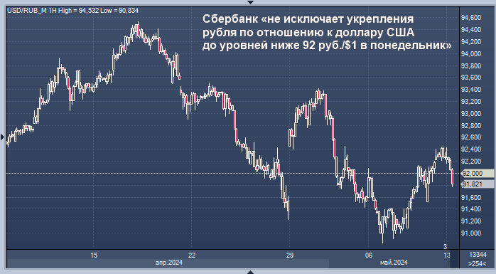 "Мы не исключаем укрепление рубля по отношению к доллару США до уровней ниже 92 руб./$1 в понедельник; за продолжительные выходные экспортеры накопили валютную выручку и могут увеличить ее продажи", - отмечают эксперты инвестбанка . "Котировки нефти под давлением. По нашим прогнозам, баррель марки Brent может торговаться в интервале $82-83", - указывают в SberCIB.