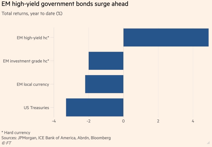 Высокодоходные государственные облигации развивающихся стран растут в цене. Общий доход с начала года (%). © ФТ. Источники: JPMorgan, ICE Bank of America, Abrdn, Bloomberg.