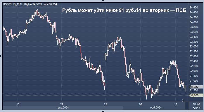 "Внутренние факторы продолжат оказывать поддержку рублю. Реализация отложенного ввиду праздников предложения со стороны экспортеров в отсутствие четких сигналов с мировых рынков может позволить курсу доллара обновить минимумы начала марта и опуститься к нижней границе нашего текущего целевого диапазона 90,5-92 руб./$1", - пишет эксперт в комментарии.