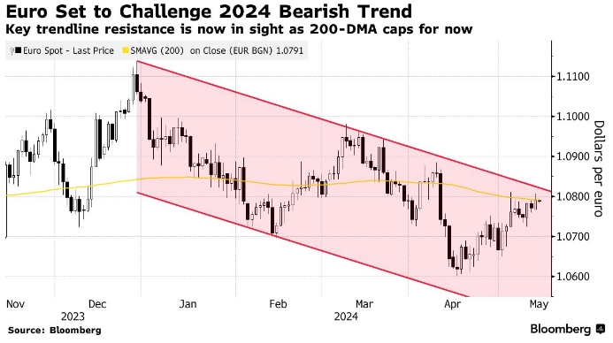 Опубликованный в понедельник опрос ФРС Нью-Йорка показал, что ожидания американских потребителей в отношении инфляции на следующий год выросли до максимума с ноября, что сдержало рост евро. Валюта в настоящее время торгуется около отметки $1,08, тестируя 200-дневную скользящую среднюю и близка к тому, чтобы бросить вызов медвежьему трендовому каналу этого года.