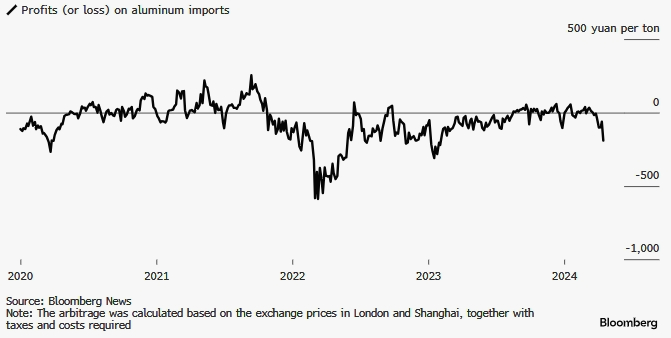 Прибыль (или убыток) от импорта алюминия. Арбитражная сумма была рассчитана на основе биржевых цен в Лондоне и Шанхае, а также необходимых налогов и издержек.